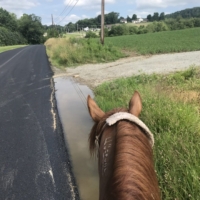 An Amish buggy comes towards us on the main street through French Creek State Park. I think "gee, Finley's been a trooper with traffic so far- cars, semis, motorcycles. This should be a breeze!." When the buggy near, he pulls back and rears, knocking me onto my butt, before running away.